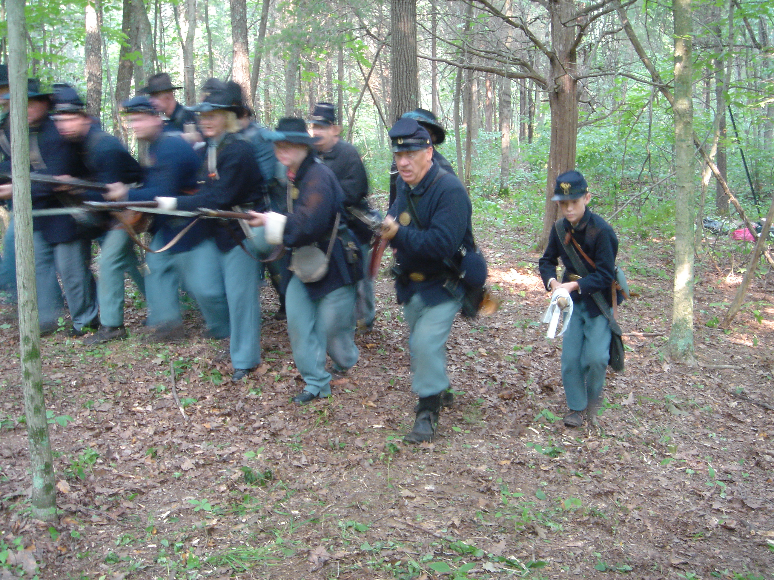 Recording at Chickamauga Battlefield commenced on Thursday, August 10th with panoramic shots of the area filmed from the top of the famous Wilder Tower in the park. From there, production moved to Snodgrass Hill, where the 22nd Michigan would see their bloodiest fighting. Filming of the 22nd Michigan Monument, which sits on the crest of the Hill, as well as shots of the Snodgrass House and surrounding fields, and of the cannons around the area. Returning for a final day of filming on August 11th before returning north, they began early in the morning with shots of Chickamauga Creek. Filming this day would be hindered by intermittent rainfall, however all shots on the schedule would be recorded including shots of the Kelly House and the area along the Lafayette Road as well as the Dyer House and fields. Finally, the crew returned to Snodgrass HIll in search of the 22nd's original position in the gully. "We searched everywhere for signs and we think we found it, but aren't really certain," says Wayne. "I must have walked over a mile around the entire base of Snodgrass Hill, filming it at all different angles. Somewhere on there I had to have gotten it!" With filming complete at Chickamauga Battlefield, the crew returned home to Ohio to prepare for the largest and most complex of all the filming weekends for the film - the Chickamauga Battle Scenes. Scheduled for the weekend of August 18th-20th, 2006, a call went out for as many re enactors as possible to attend in order to get the feel of a "large scale battle" in the shots. "Once again we didn't know how many re enactors we would get, but by this time we had the cooperation of the 4th Ohio Infantry on our side as our 'core' group, " says David. "We knew with their help we could manage to get what we needed no matter how many showed up." As filming in the original park would have been impossible, a replacement site needed to be found. As it happened, a member of David's family stepped up to solve this problem and filming was set to take place near the small town of Felicity in southwestern Ohio. Friday, August 18th began with filming on the ridge substituting for Snodgrass Hill. Shots completed this day would include the building and fighting at the breastworks, searching for ammunition among the dead, and Johnny's attempts to elude and escape from the Confederates near the end. Production ended early this day, in order to give the re enactors time to set up and camp, and allow others to arrive and settle in. Everything was set for the weekend.