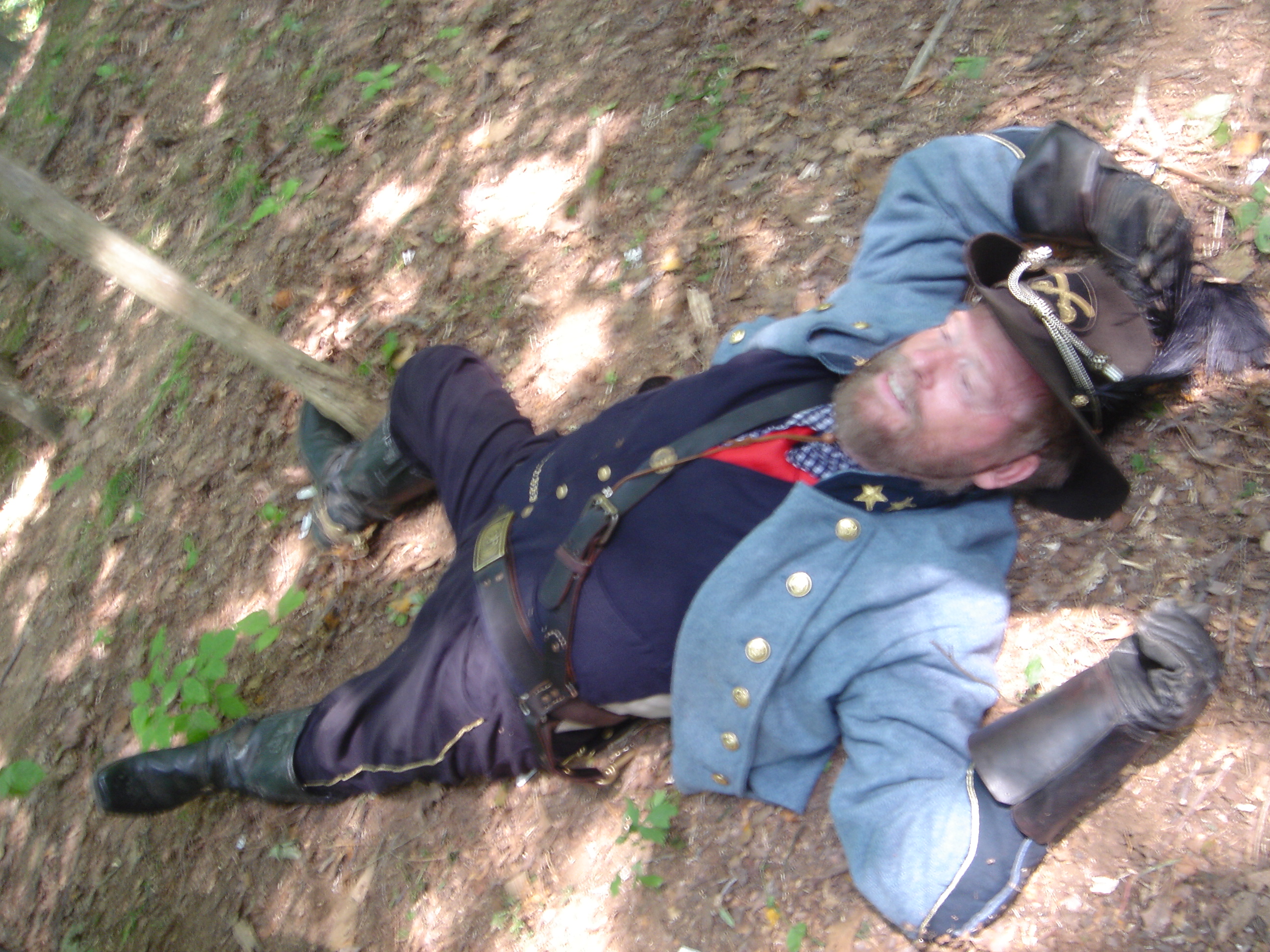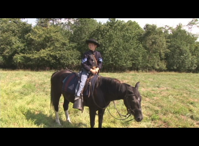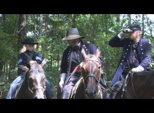 Another on-set call of 8am brought everyone back to the location, this time taking a break from the battle at Chickamauga to focus on Johnny's capture by General Wheeler's Cavalry, an important part of the fifth act of the film. However, the day would not start without problems, as it seemed for a while that production would come to a halt and the crew would be forced to cancel the remaining scenes. "Cody got stung. The poor boy! As we were setting up our first shot in the field adjacent to the ridge where we filmed the day before, Cody stumbled right into a hornet's nest and was stung on the hand. He had a horrible reaction to the sting, too. We were about to have him rushed to the hospital when a few medically-trained members of our cast came to his rescue." Pumped full of Benadryl and packed with ice, the star returned to the set ready and willing to finish the day's shoot. The remaining shots included all scenes with Cody on his horse. Returning to join us was Gary Chambers as General Thomas, appearing alongside Cody on horseback. "Cody became something of an expert rider over the weekend. He did a fantastic job. It was more than we had thought we'd be able to do but he took to riding like a natural and off he went." Afterwards, the crew returned to the ridge to finish off the remaining battle scenes in the woods, centering mainly on the regiment's movement down the hill. And then, finishing off the day was a final scene where Johnny is shot in the ear while on horseback. "Cody spent some time learning to fall off that horse." says David. "We had recorded the scene of Johnny being shot back in June, but we didn't have access to horses at the time and didn't think we would at anytime so we started the shot with Johnny already lying on the ground. But now we had the chance to film the beginning of the scene and then edit the two parts together. It was flawless." Although the scene required nearly a half-dozen retakes, it was finished and production ended for the weekend.