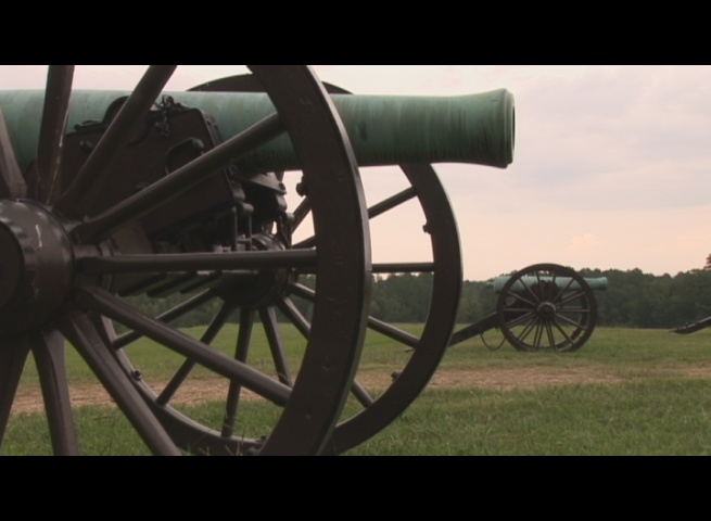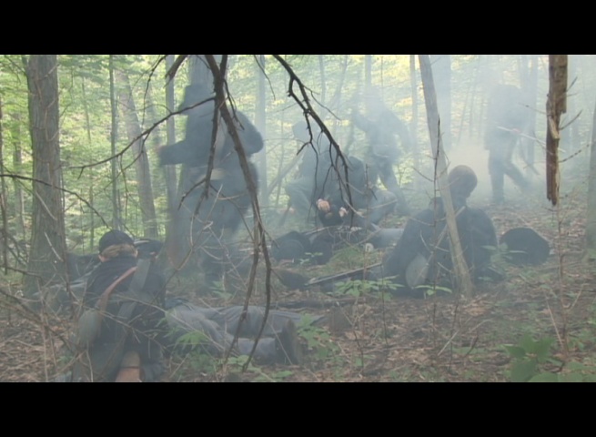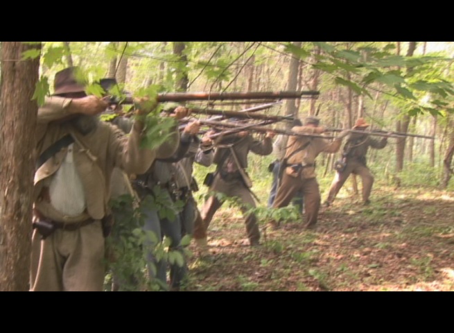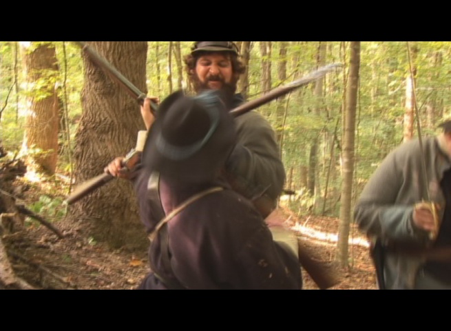 Filming moved to the same breastworks that had been used the previous day, where filming of the Confederate charge up the hill would take place as well as hand-to-hand combat between the opposing sides. "These shots are some of my favorite in the film. We had just enough people to make it look good, but not too many that we couldn't control the set, "says Wayne. "All the re enactors were very dedicated to making the shots look as realistic as possible, and worked very hard to choreograph the hand-to-hand just right. There were a couple of times where we were worried that they would hurt themselves, but we shouldn't have feared. They knew exactly what they were doing." |